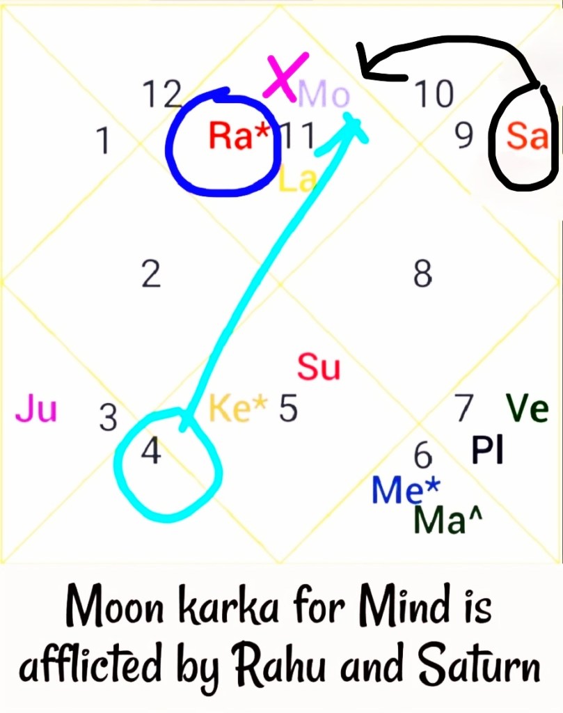 1. Afflicted Moon makes one mentally unstable, lacks one in fair thinking. Rational approach to look from fair point of view on matters, and conclude unbiased outcome, can be done only by a person whose Mind is healthy and strong. Here, in this case Moon is badly afflicted due to:-