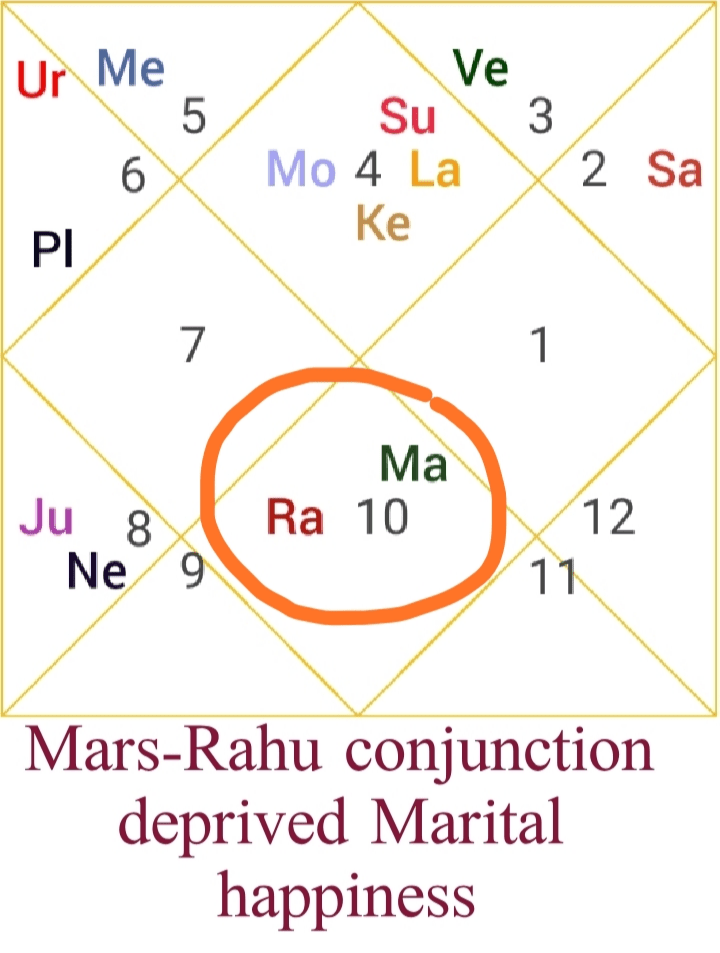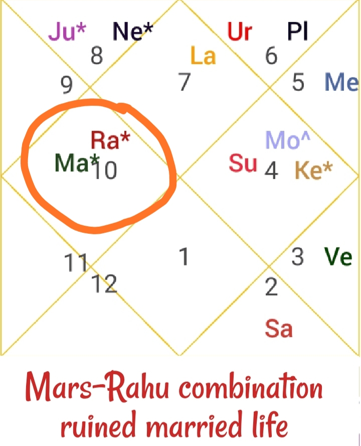 1.Mars Rahu conjunction is formed in seventh house of Relationship, henceforth it spoiled the relation with Life partner.