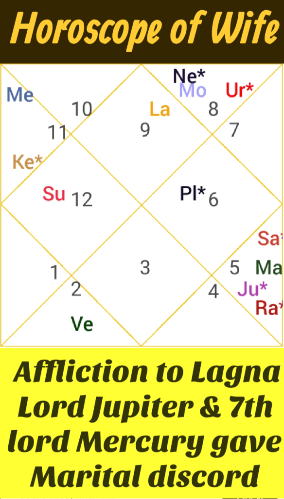 From the onset of Mercury sub period friction between husband and wife started, as Mercury lord of spouse is badly afflicted therefore it disrupted the smooth going life