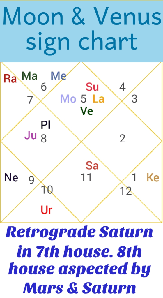 - From Moon and Venus sign, as both are in Leo sign, so chart is same. Here affliction on seventh & eighth house is clearly visible by way of malefic planets Mars and Saturn, therefore she couldn’t enjoy happy married life.