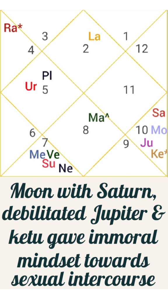 Influence of planets under which one indulges in sexual intercourse with multiple partners are Venus, Mars, Rahu, Saturn and Mercury. Any association of above mentioned planets with each other makes fornication yoga in horoscope.