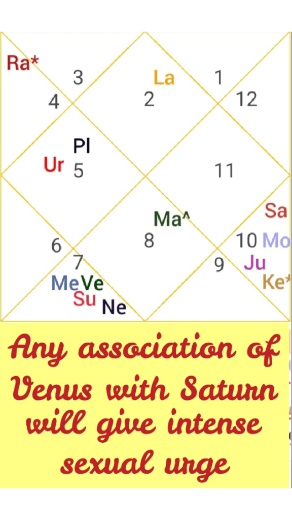 Whenever Venus comes under influence of Saturn, with respect to position, aspect or conjunction, one has strong Sexual urges, which one satisfies with multiple partners, be it with pets, lesbian sex or other means. Sexual orientation will be such that one desires to have sexual intercourse with more people, more often.