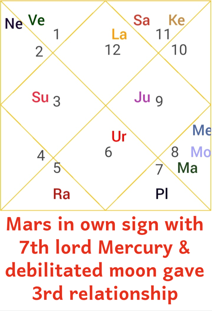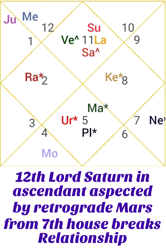 - Mutual aspect between twelfth lord Saturn with retrograde Mars in 1/7 axis gave divorce.