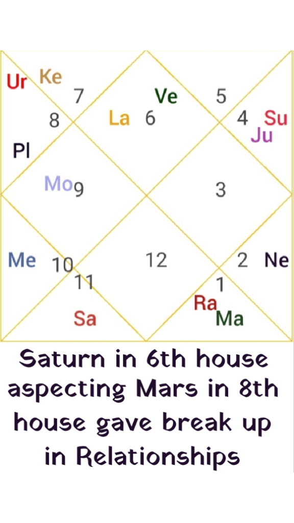 Aspect of Mars on Rahu placed in sixth house and aspect of Saturn on Sun in eighth house gave break up in Relationship, which ended up on bad note.