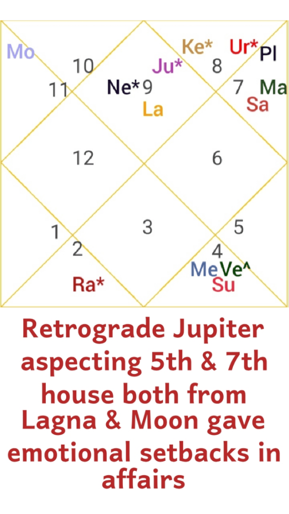 Due to retrograde aspect of Jupiter in fifth house of emotions and seventh house of Relationship, both from Ascendant and moon sign, gave her agony in love affairs.