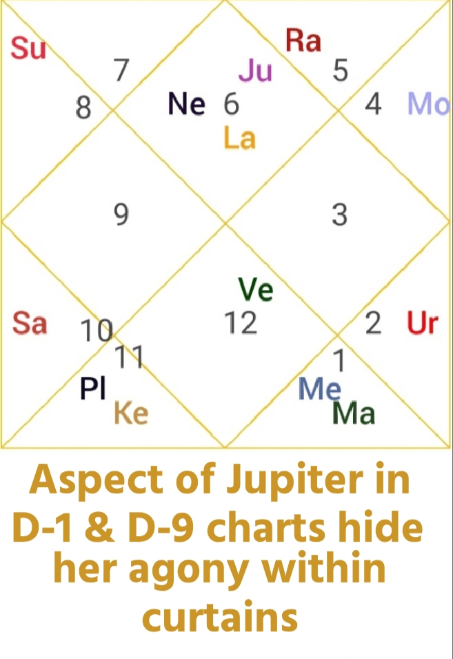 The reason why she didn’t raised her voice against the torture but preferred to keep buried between walls of her house is because in her Navamsha chart, planet Jupiter aspects her fifth house of tolerance and principals giving her ideals not to go against her husband. Aspect on Jupiter on seventh house of spouse gives her submission towards her husband. Ninth house is of moral values, which taught her endure her pains but not to break society norms by complaining about her husband .
