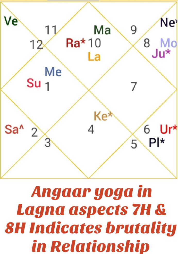 Role of Mars come when there is any brutality. Herein exhalted Mars in ascendant conjuncted with malefic shadowy planet Rahu, forms Angaar Yoga which means disharmony between couples and fights in relationship