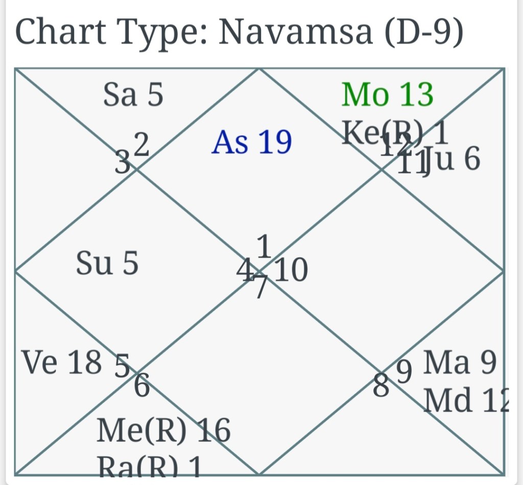 6. In the navamsha chart, sixth and seventh Lord Saturn is placed and is aspected by Venus from lagna and also eighth Lord Jupiter.