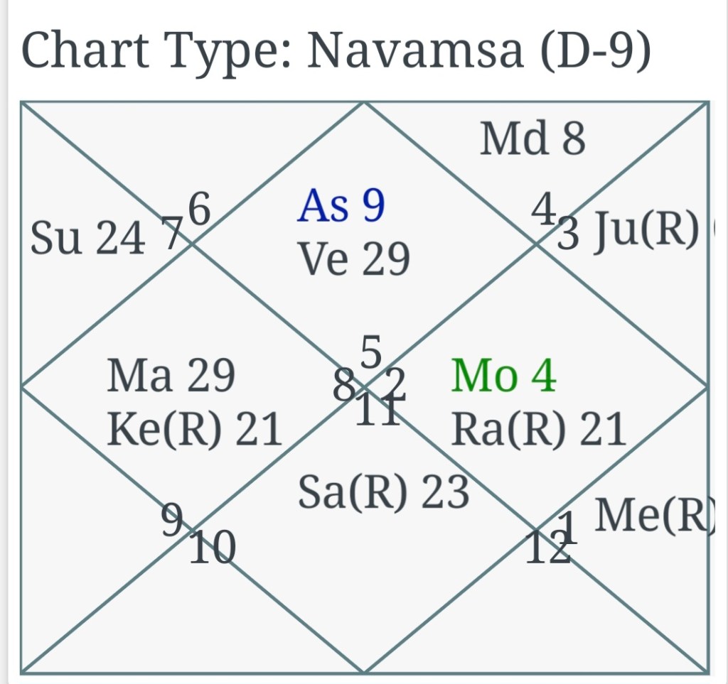 7. From the navamsha kundali, the seventh Lord Venus is placed in fifth house of son.