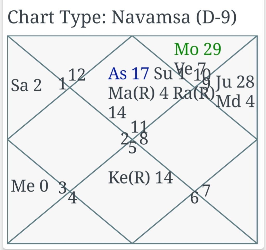 4. Ascendant Lord moon is debilitated and also compressed between Saturn and mercury. Moreover, it’s aspected by Mars posited in the sign of Venus. This further tells about her mental trauma, which she has to undergo because of these incestuous relations with brother