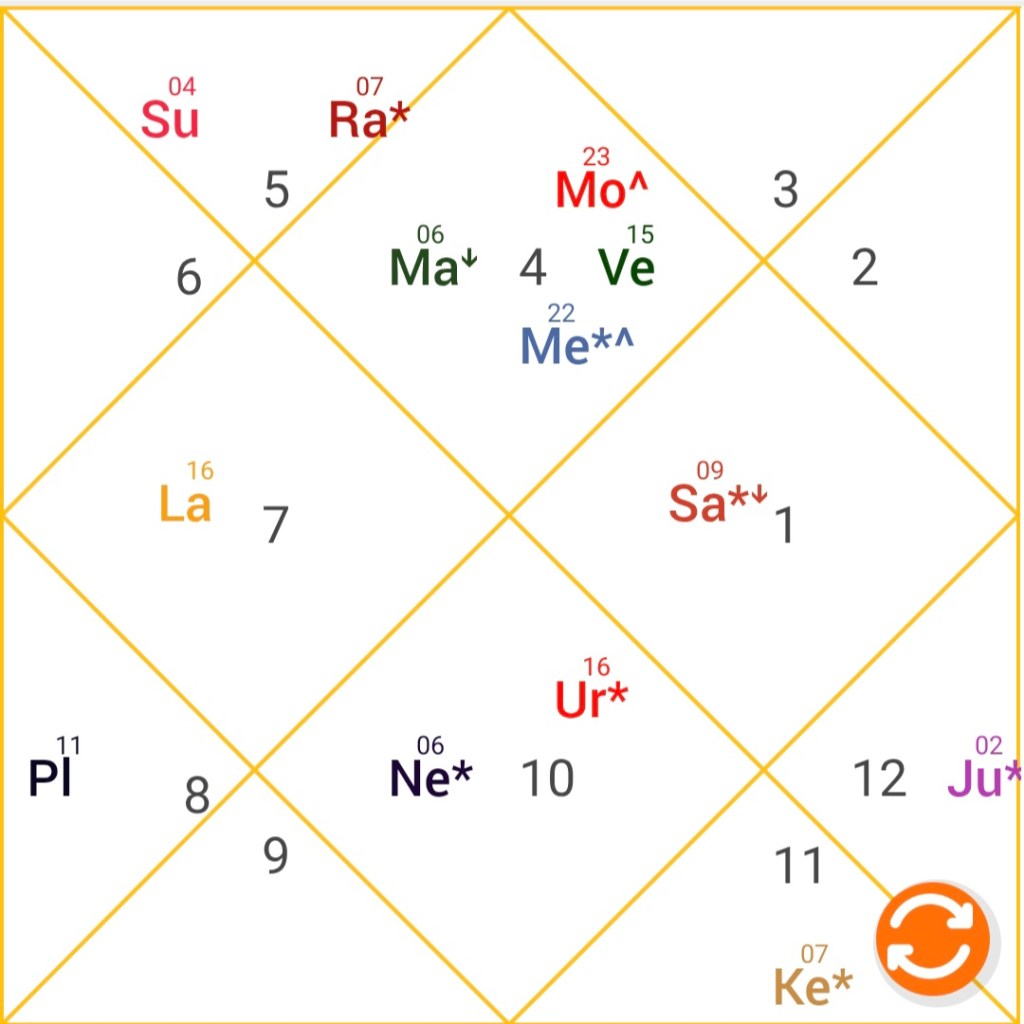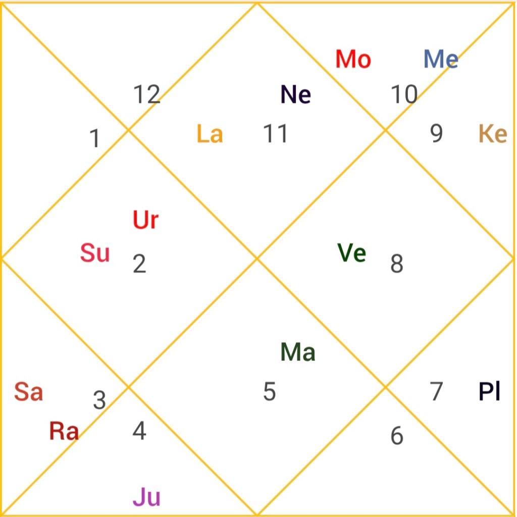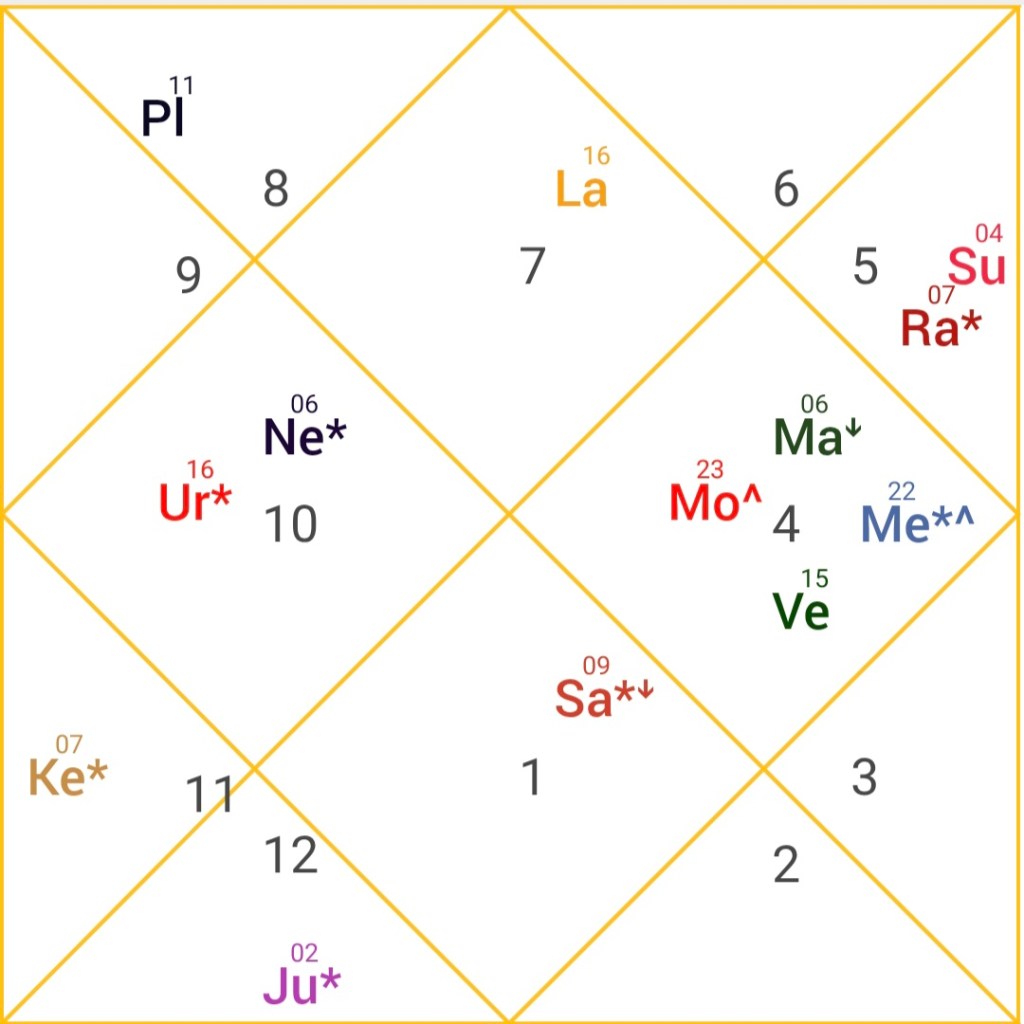 From the Ascendant, Jupiter is placed in the 6th house in its own sign, but in retrograde motion. While Jupiter is a benefic planet, its placement in the 6th house indicates disputes, legal matters, and conflicts, especially in relationships.