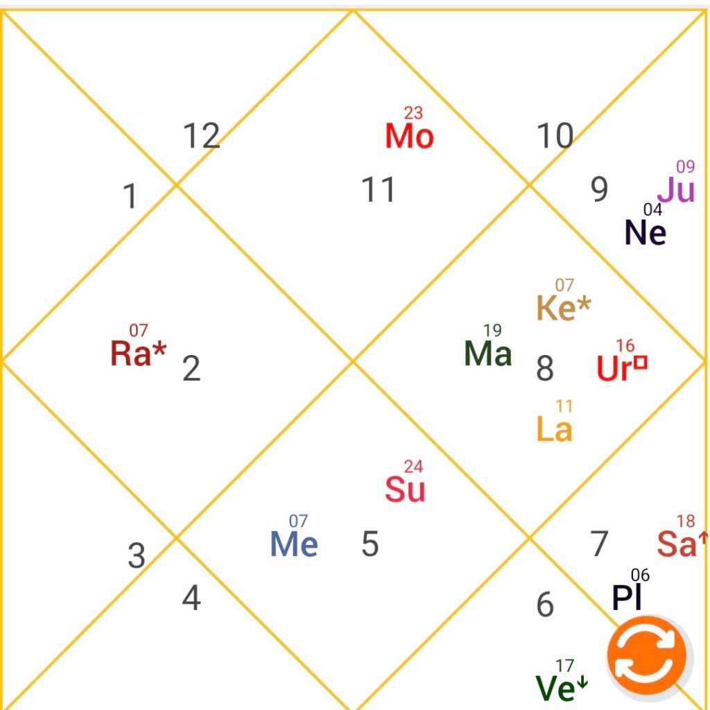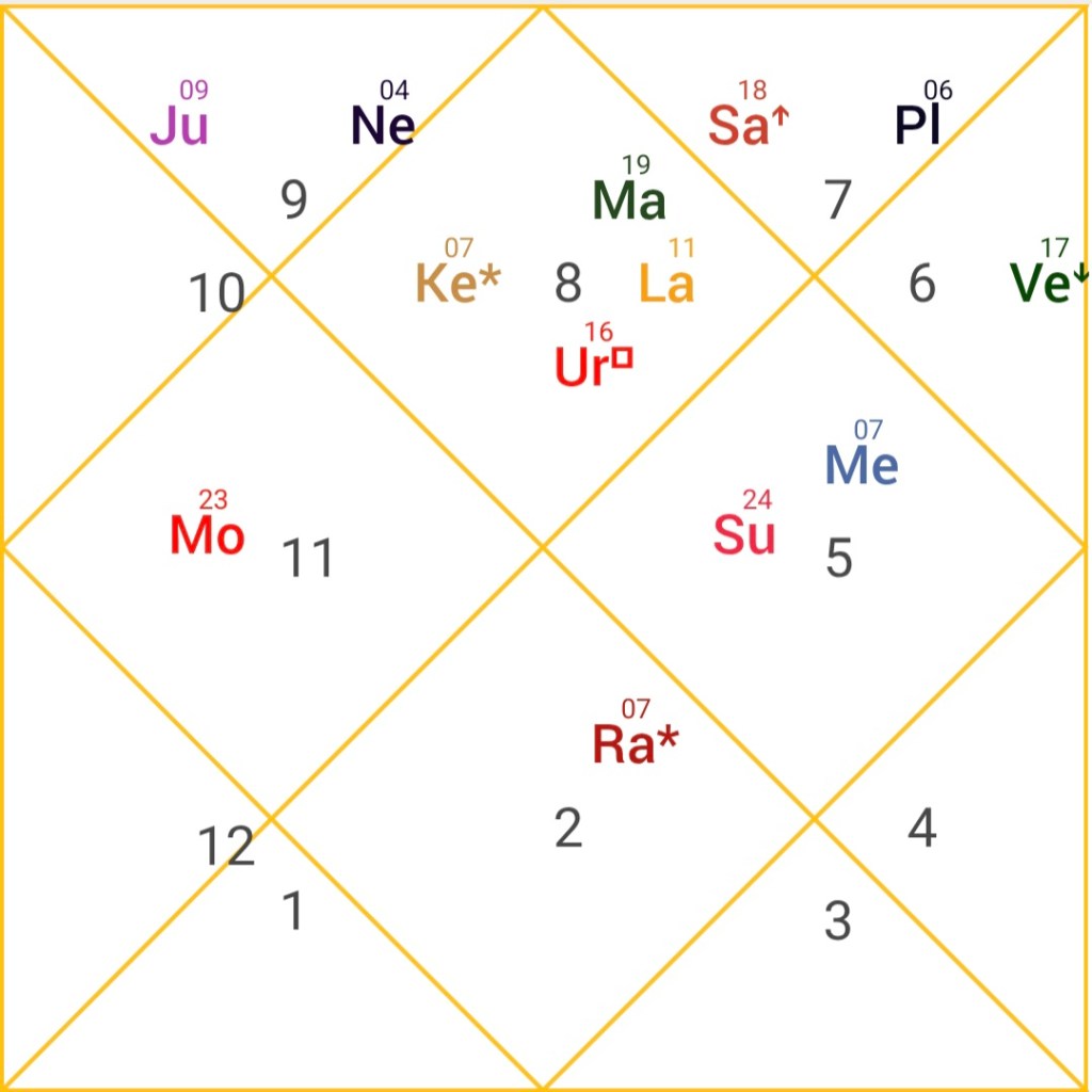 Rahu is the planet of unorthodoxy and obsession. It is placed in the 7th house of partnerships. This position is in the exaltation sign of Venus. Rahu is also in mutual aspect with Mars.