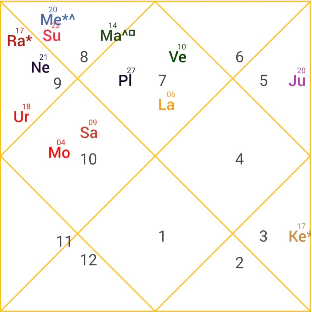 - 7th and 12th lord Venus conjunct 8th lord Mercury, both placed in Saturn’s sign.
